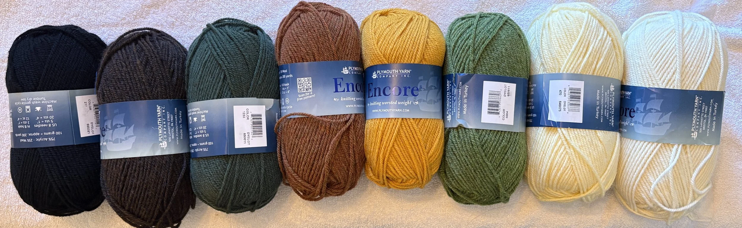 6 Skeins Medium Brown Color # 1445, 4 Skeins Each of: Dark Brown # 1444, Dark Green # 1233, Medium Green #6004, Medium Yellow #460, Light Yellow #470, Cream #256, and Black #217