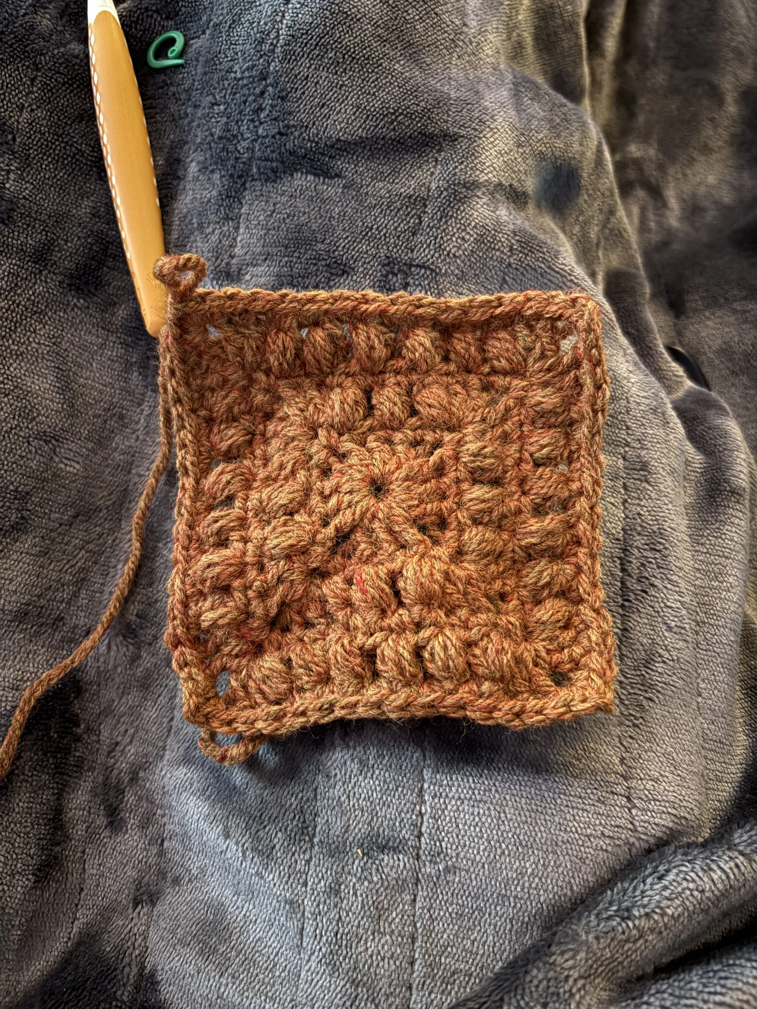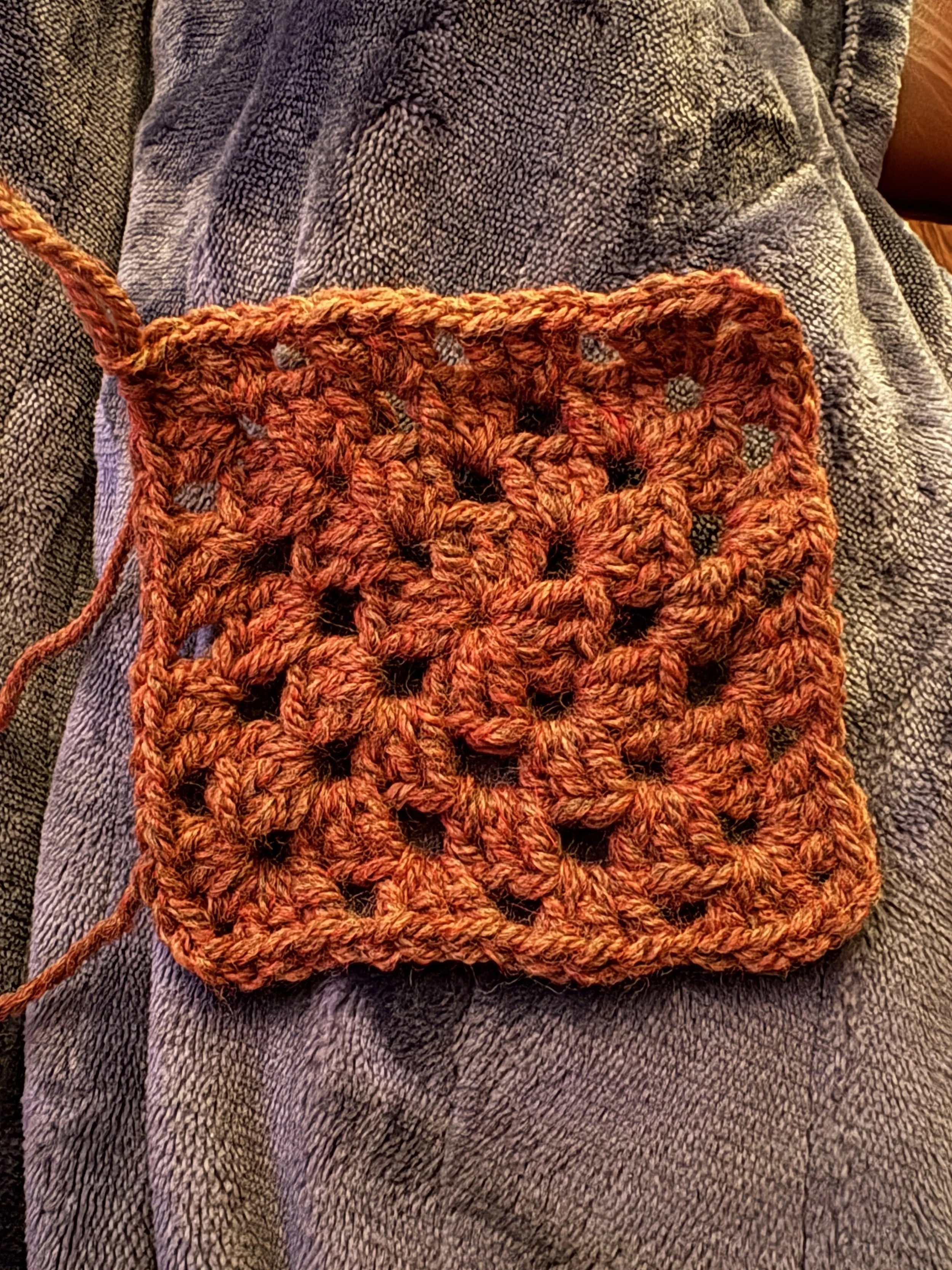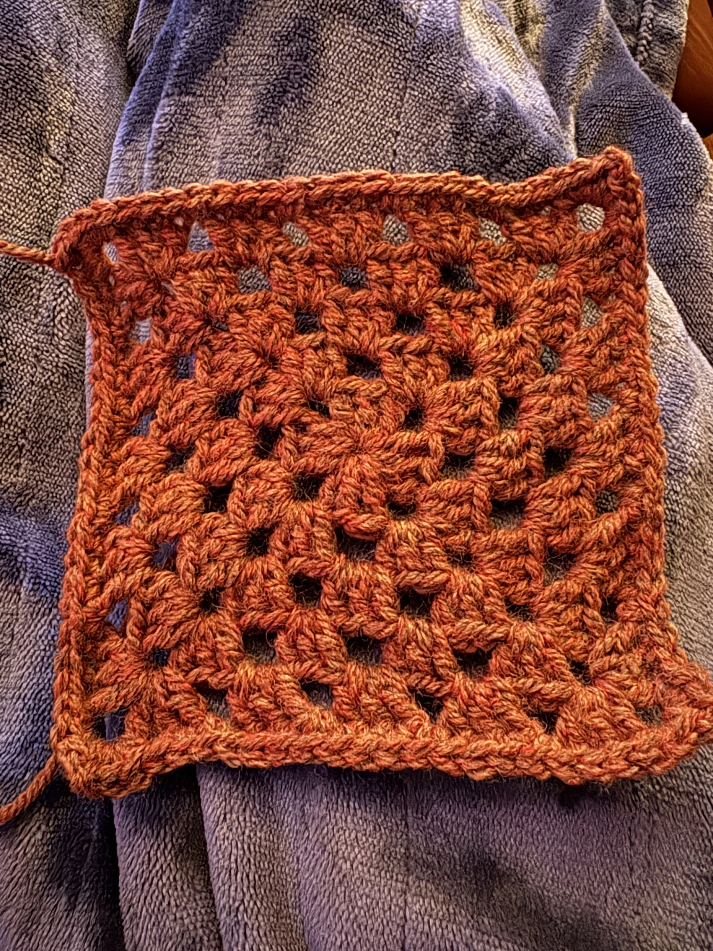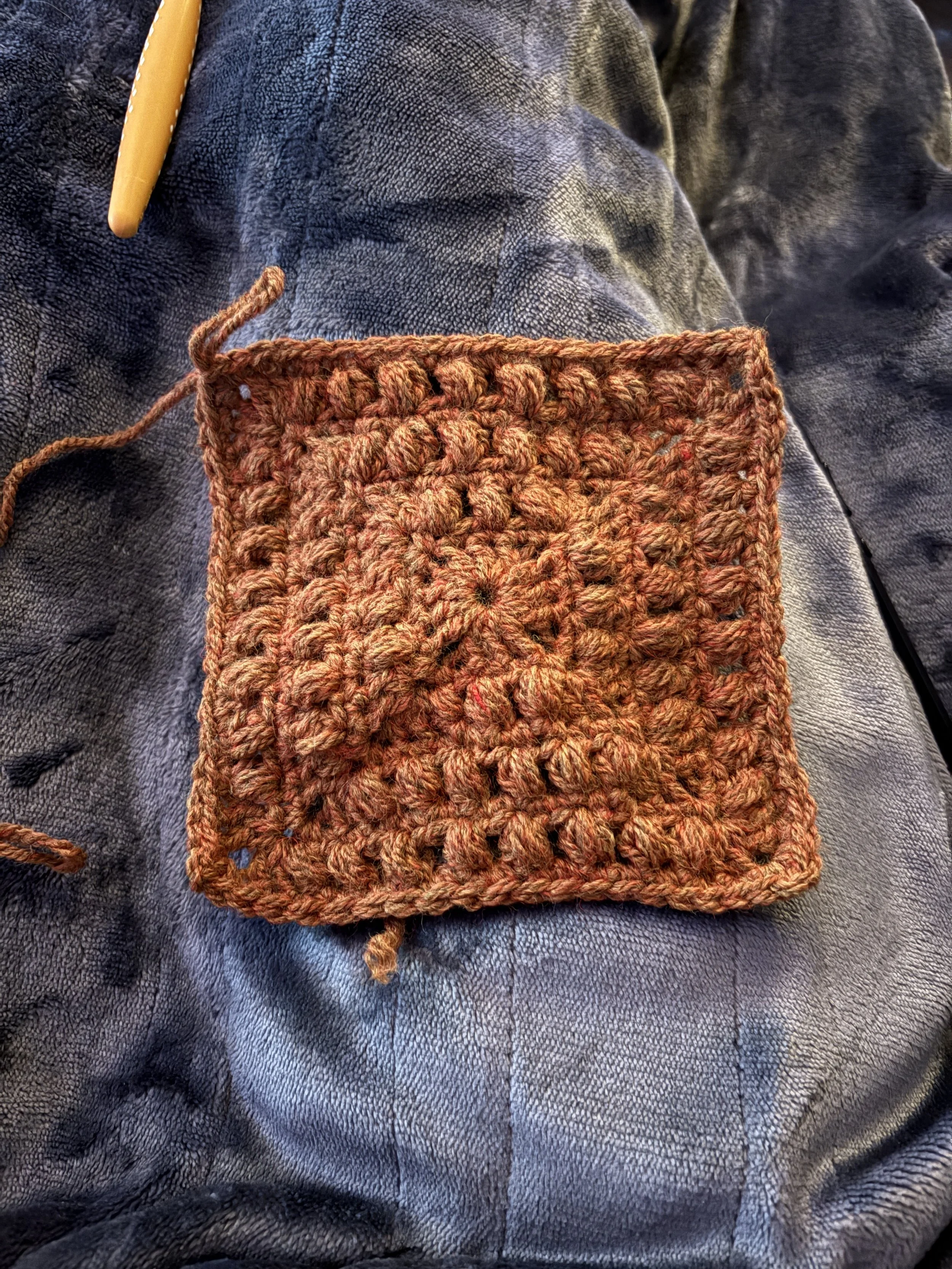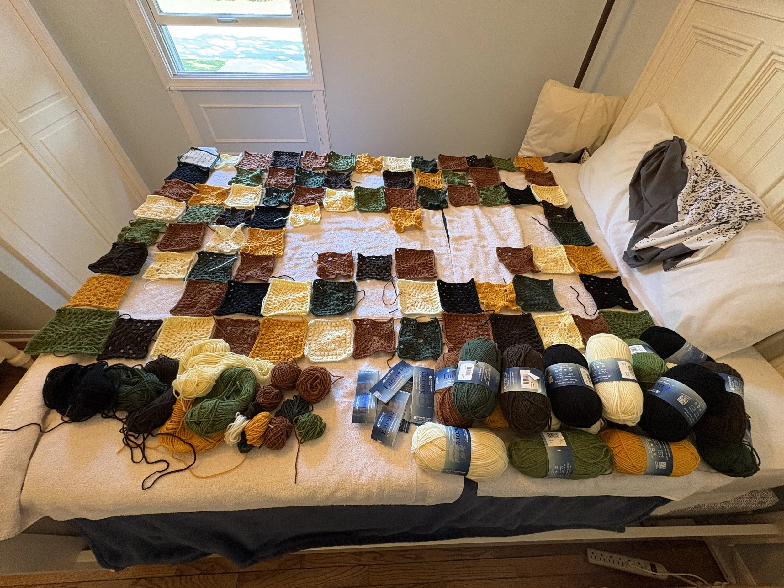 This blanket is 8 squares wide by 13 squares long, equaling 104 squares. Each square is approximately 6”x6”. Each square takes an average of 40-50 minutes to complete. All told, this blanket, including putting it together & edging, took about 90 hours.