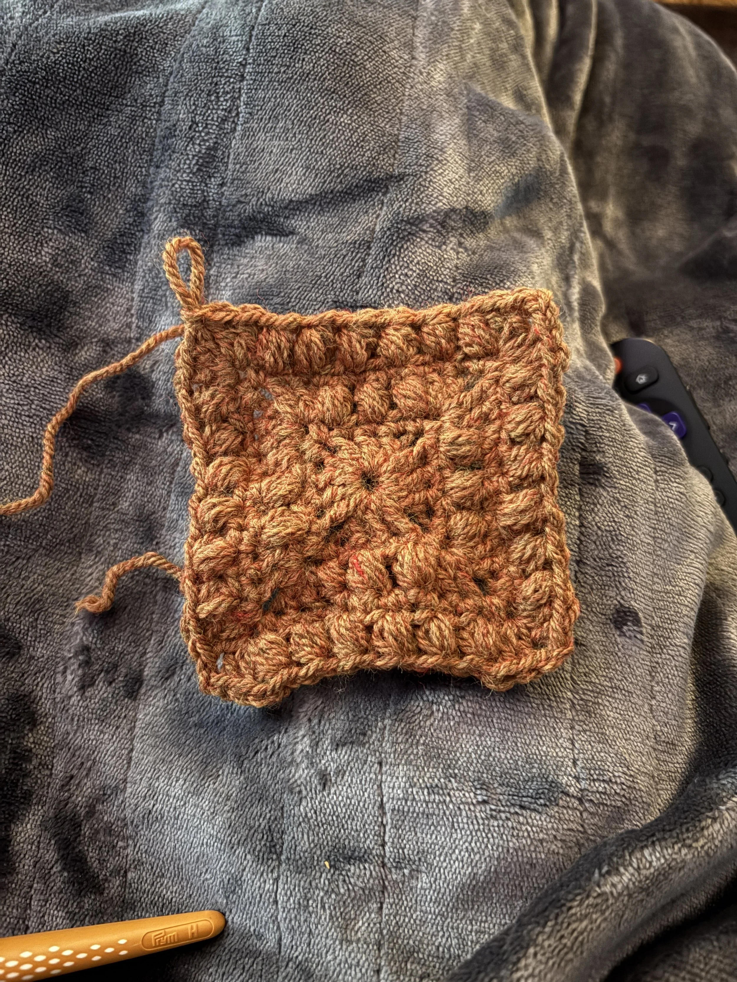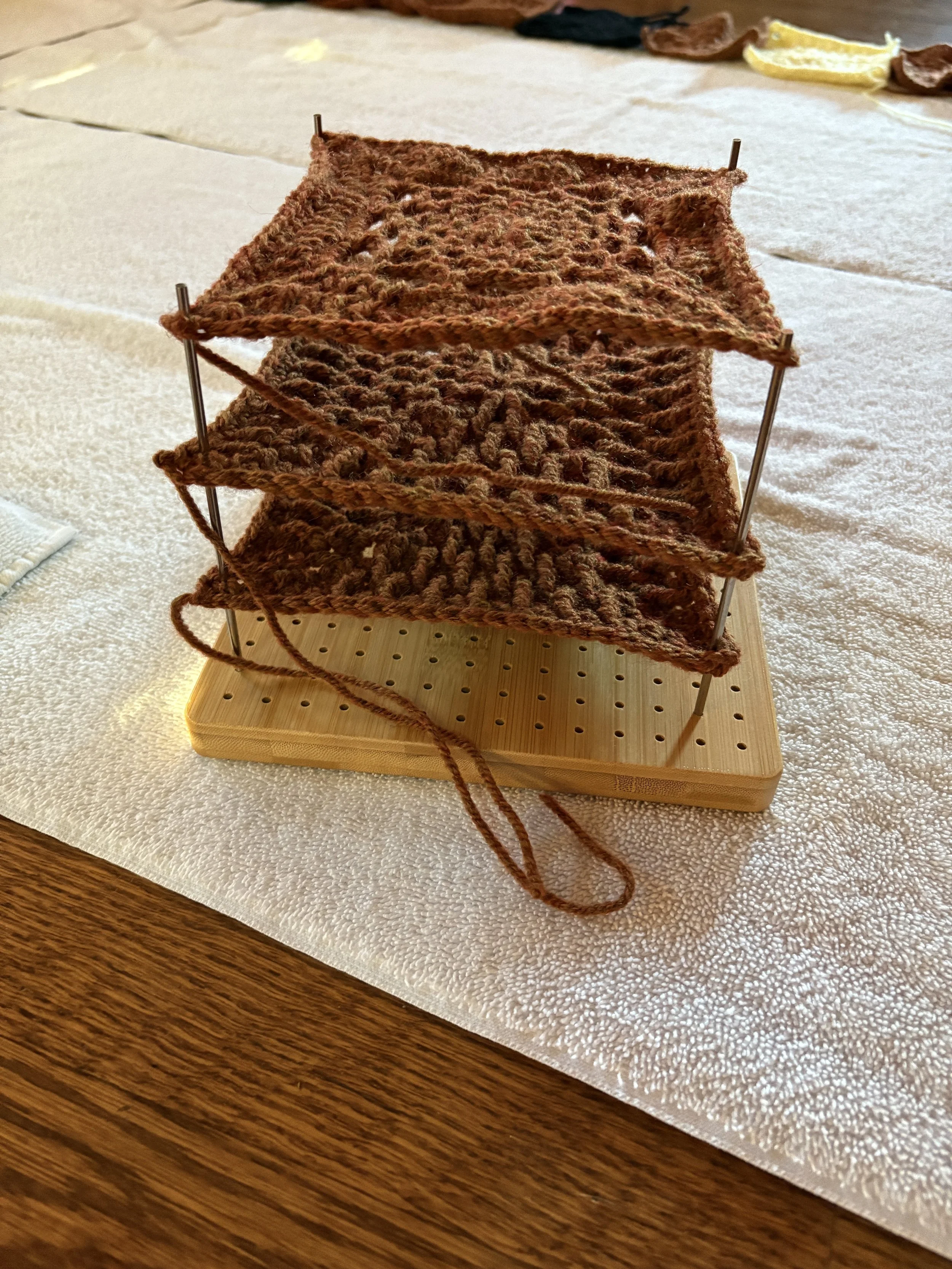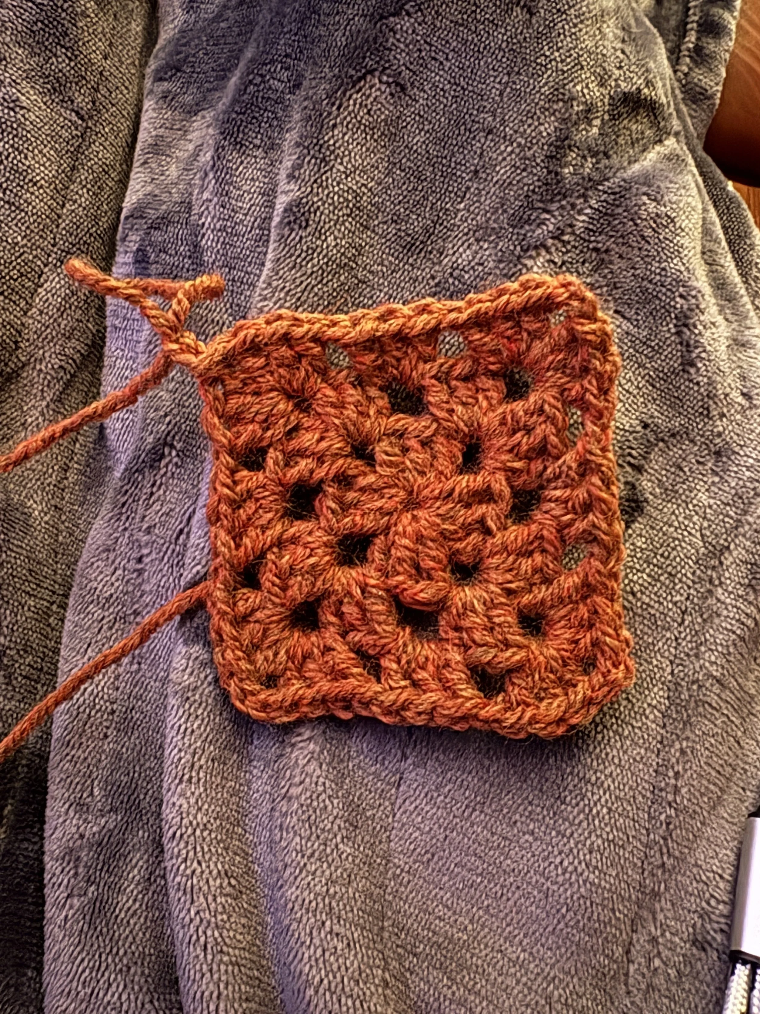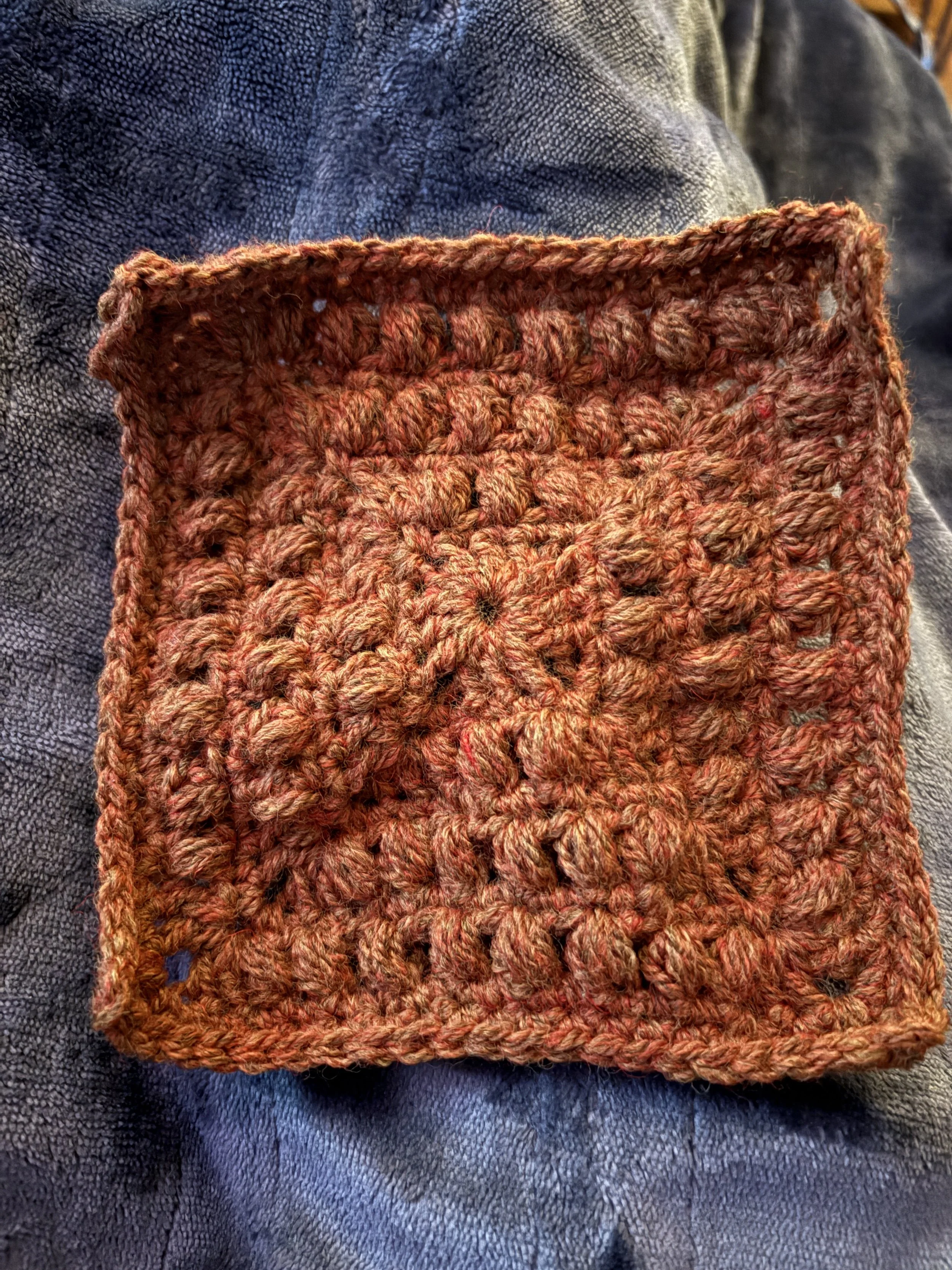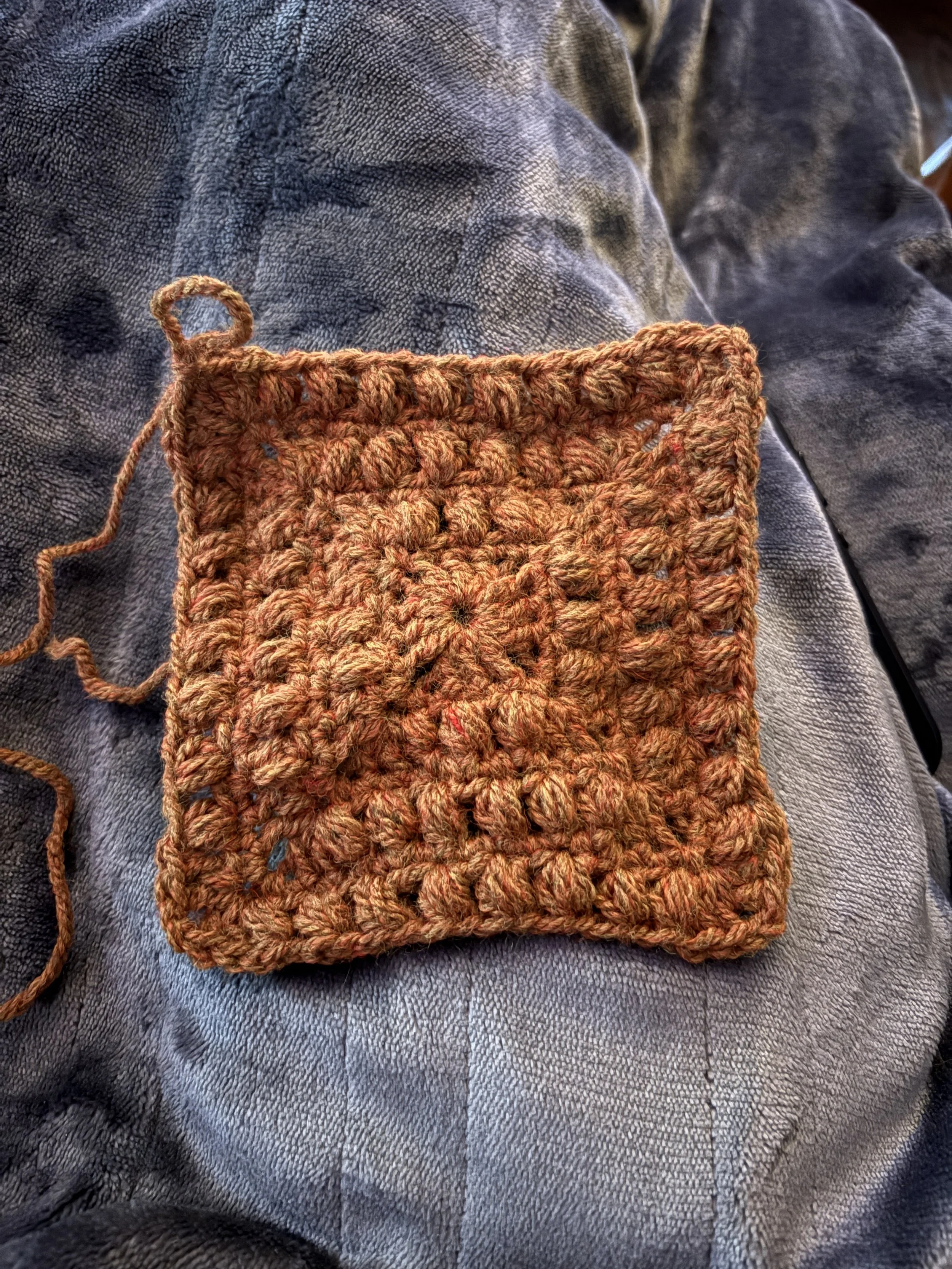 This blanket is 8 squares wide by 13 squares long, equaling 104 squares. Each square is approximately 6”x6”. Each square takes an average of 40-50 minutes to complete. All told, this blanket, including putting it together & edging, took about 90 hours.