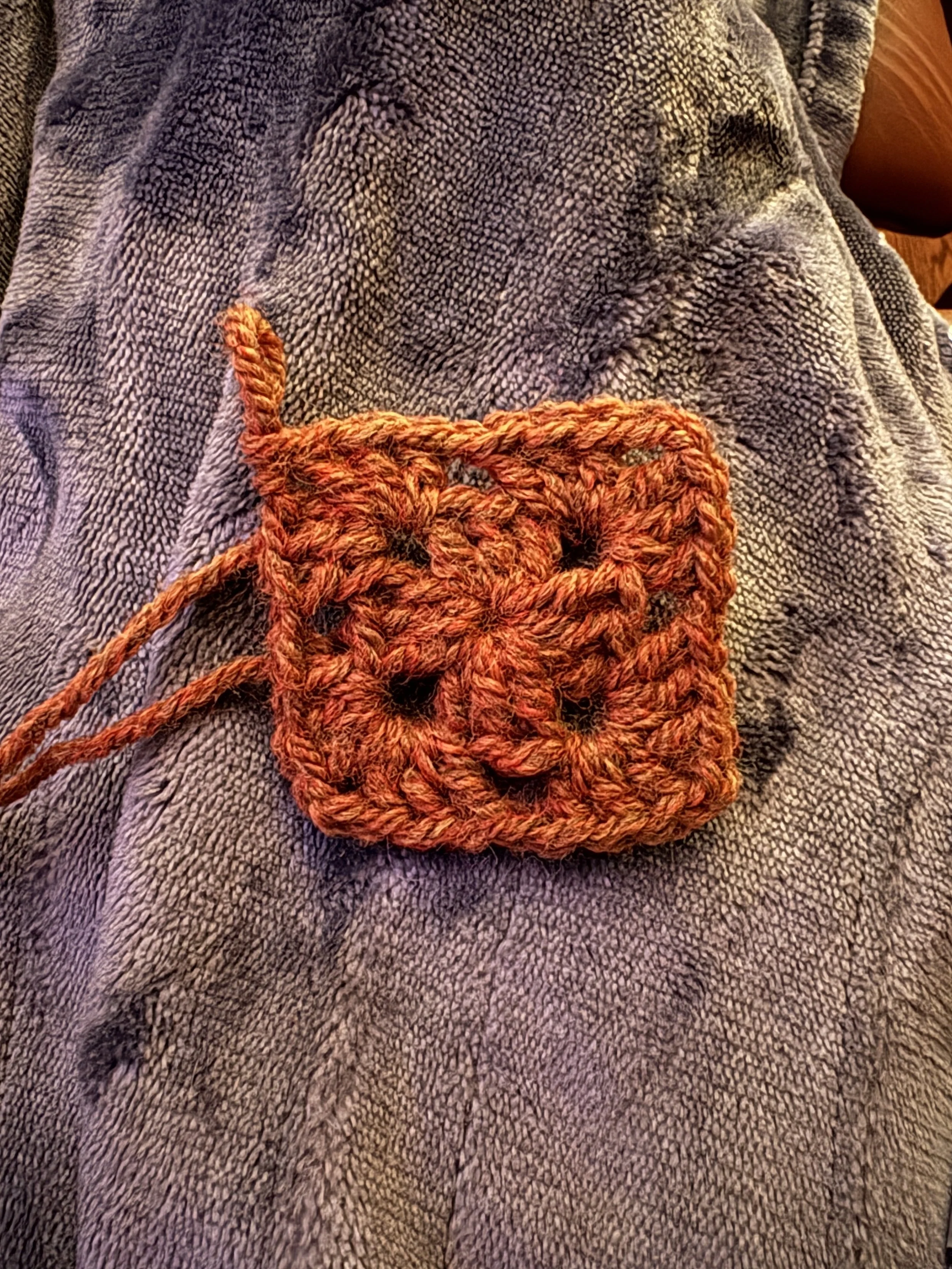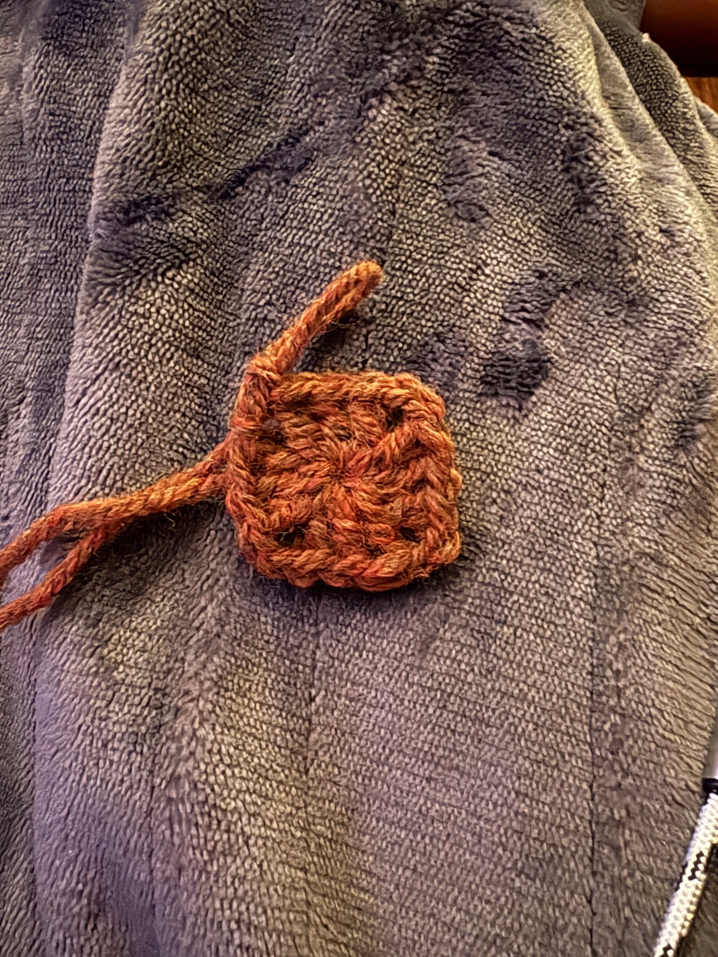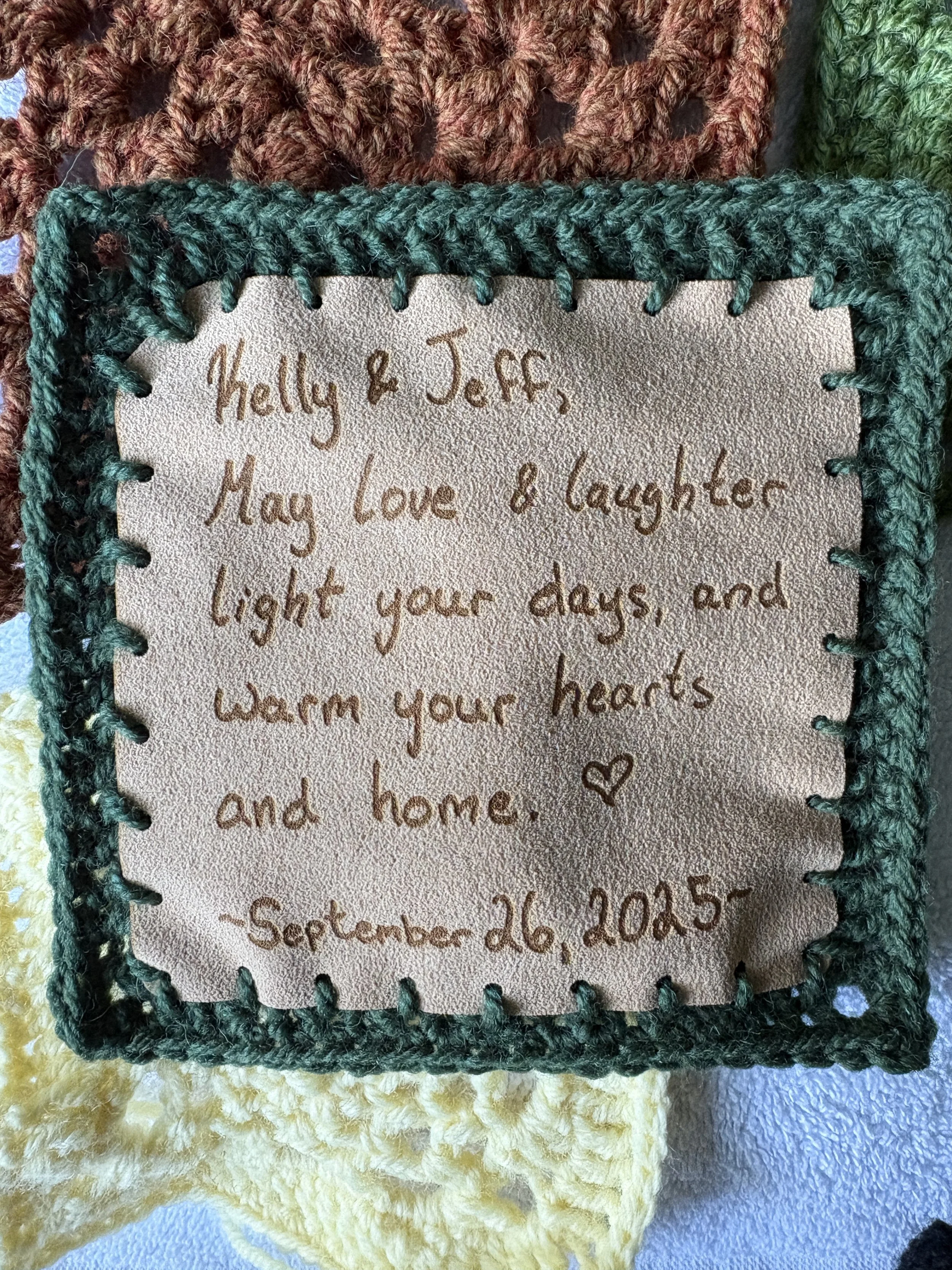 Hoooo-boy the granny squares! There are 8 different crocheted granny square patterns that make up this Afghan size blanket. Created using 8 yarn colors from the Plymouth Yarn Company “Encore” line of wool & acrylic blend yarns. I made this blanket with a whole boat load of love for my niece and her fiancé as a housewarming gift. Links to the pattern creators as well as the artists that created the suede note and blanket tag are included on this page.