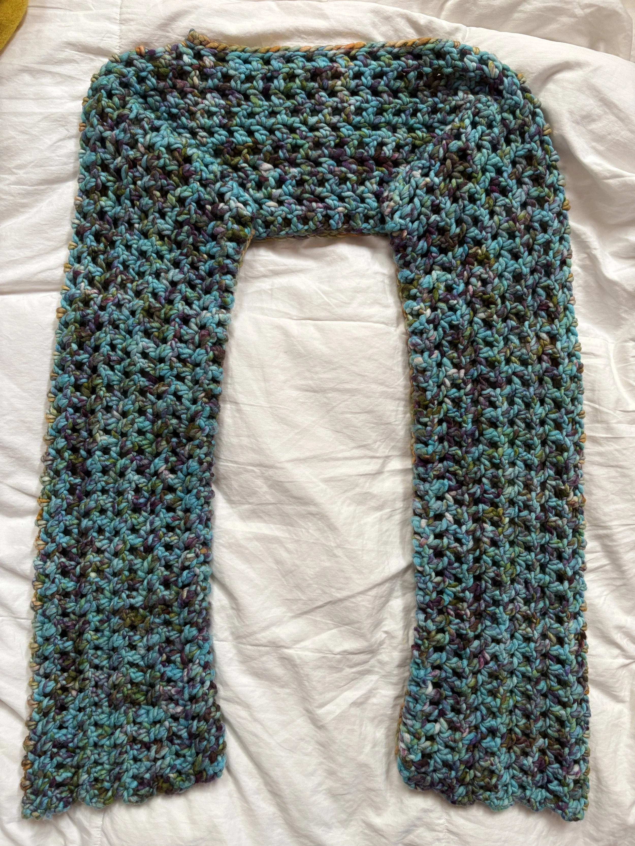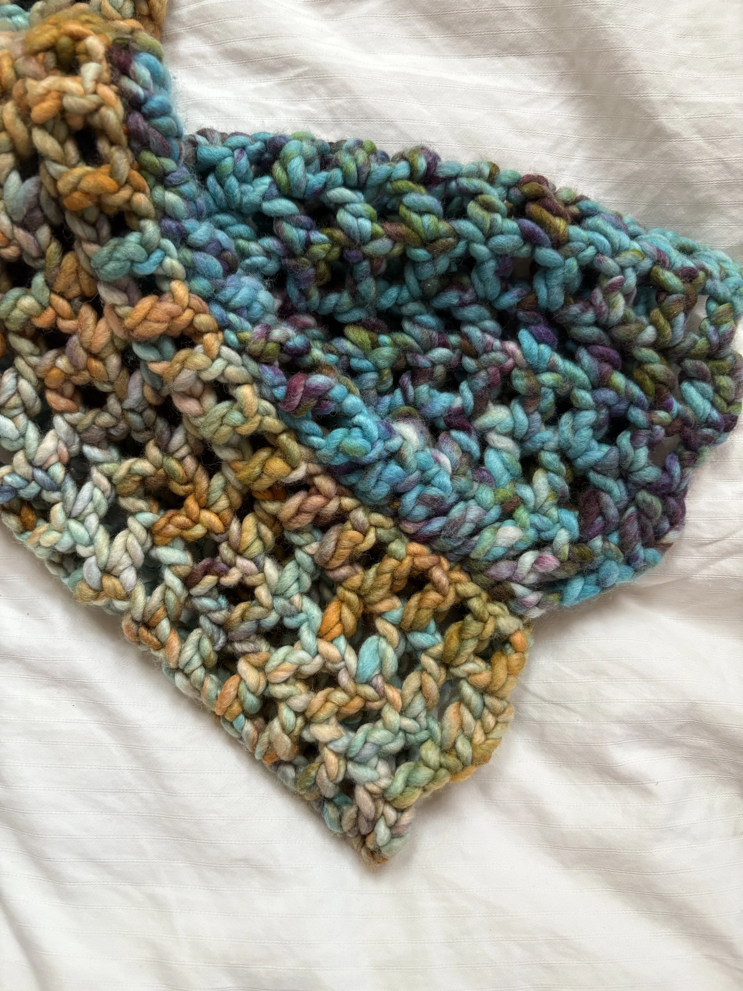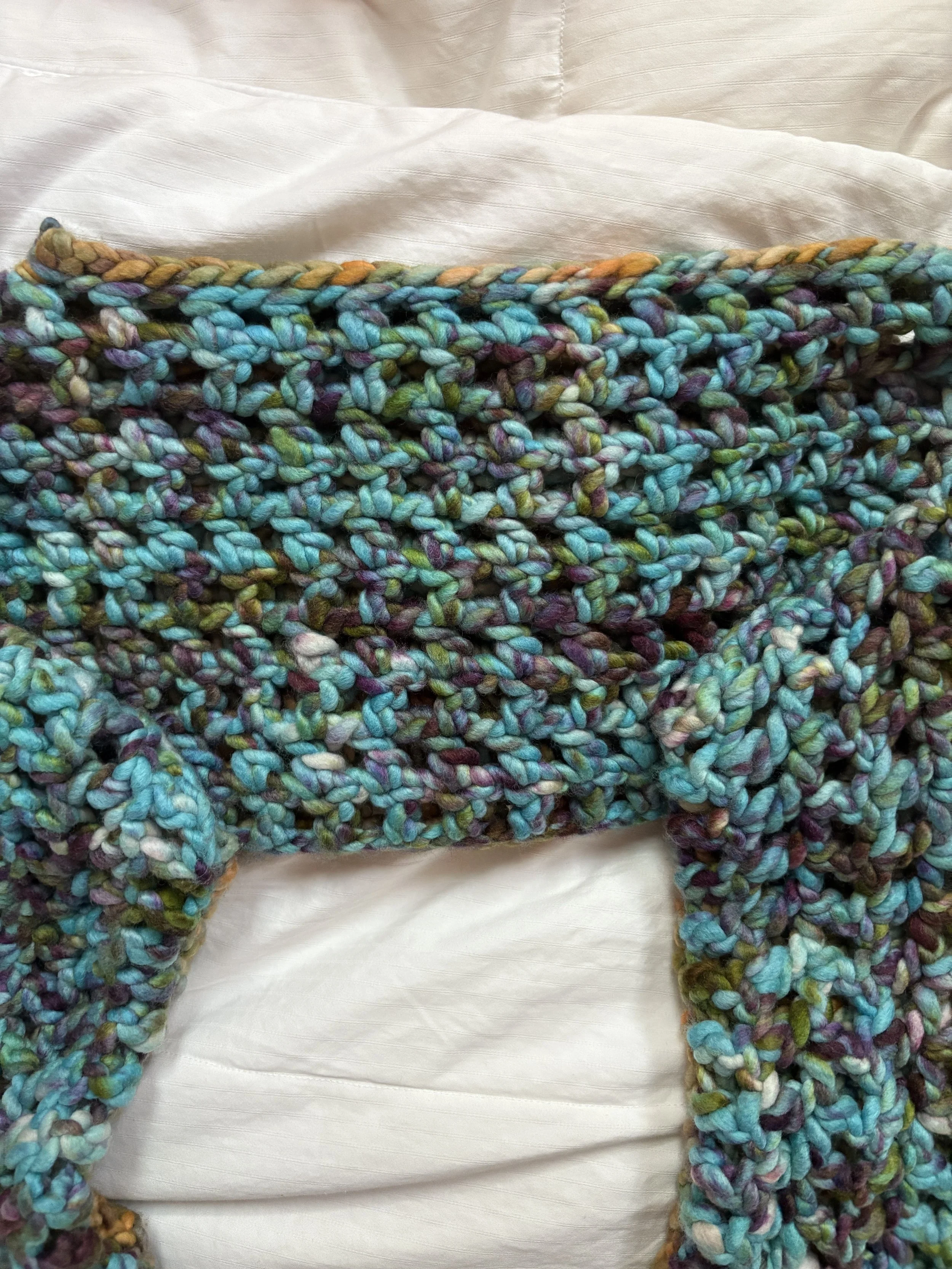 This project is worked as a long rectangle of double crochets that create the square mesh look. The neckline is created using changes and skipped stitches. I made it extra long in the sleeves and hand-washed with wool detergent before blocking it. One side is predominately color Amphibian with the neckline detail in Boomerang. The other side is Boomerang with the neckline detail in Amphibian. I also added a small charm of Minnesota at the end of one of the sleeves since I bought the materials and crocheted the whole project on a family vacation to Ely, MN. This is partly why I don’t have process photos only completed project photos!
