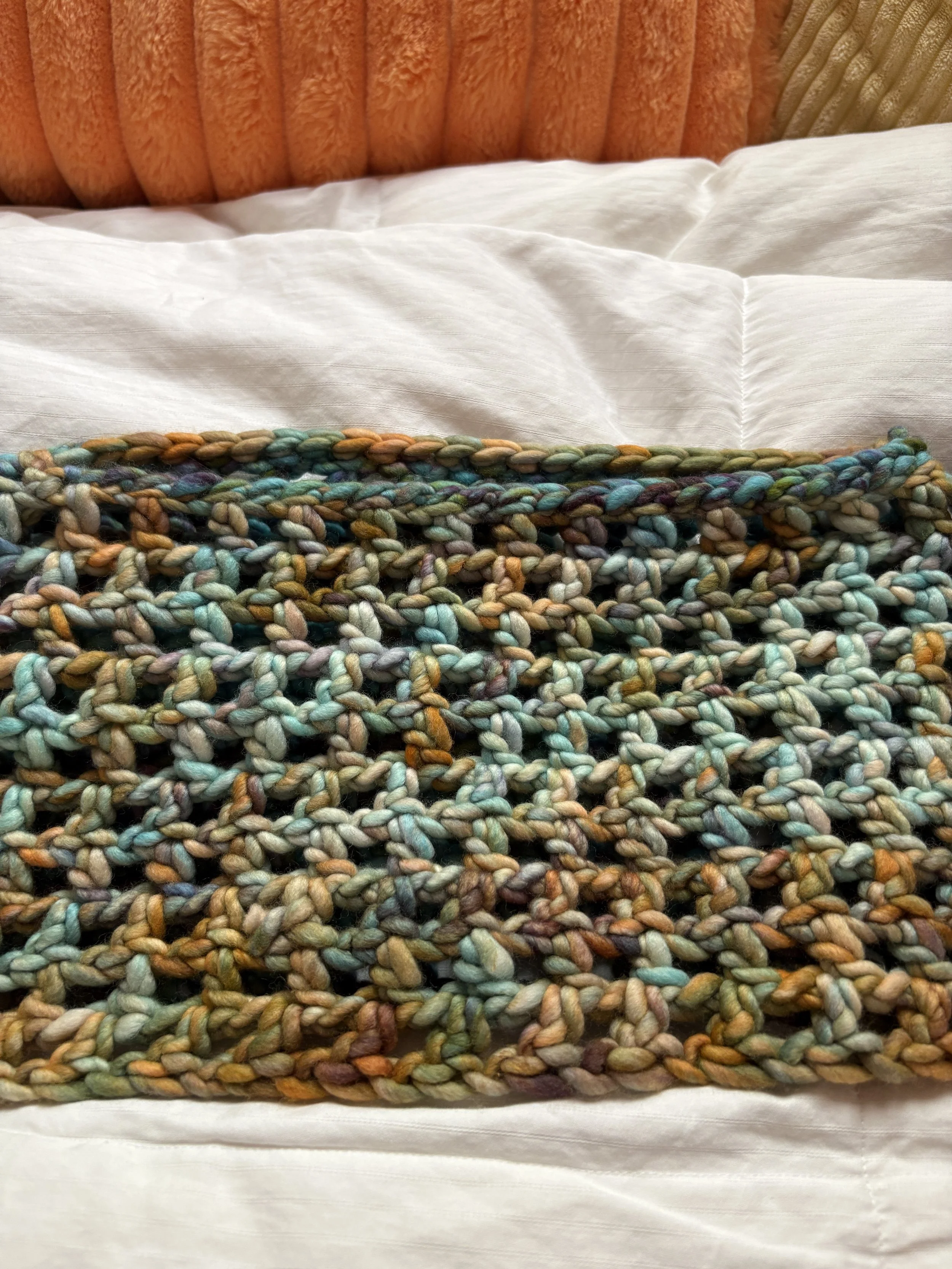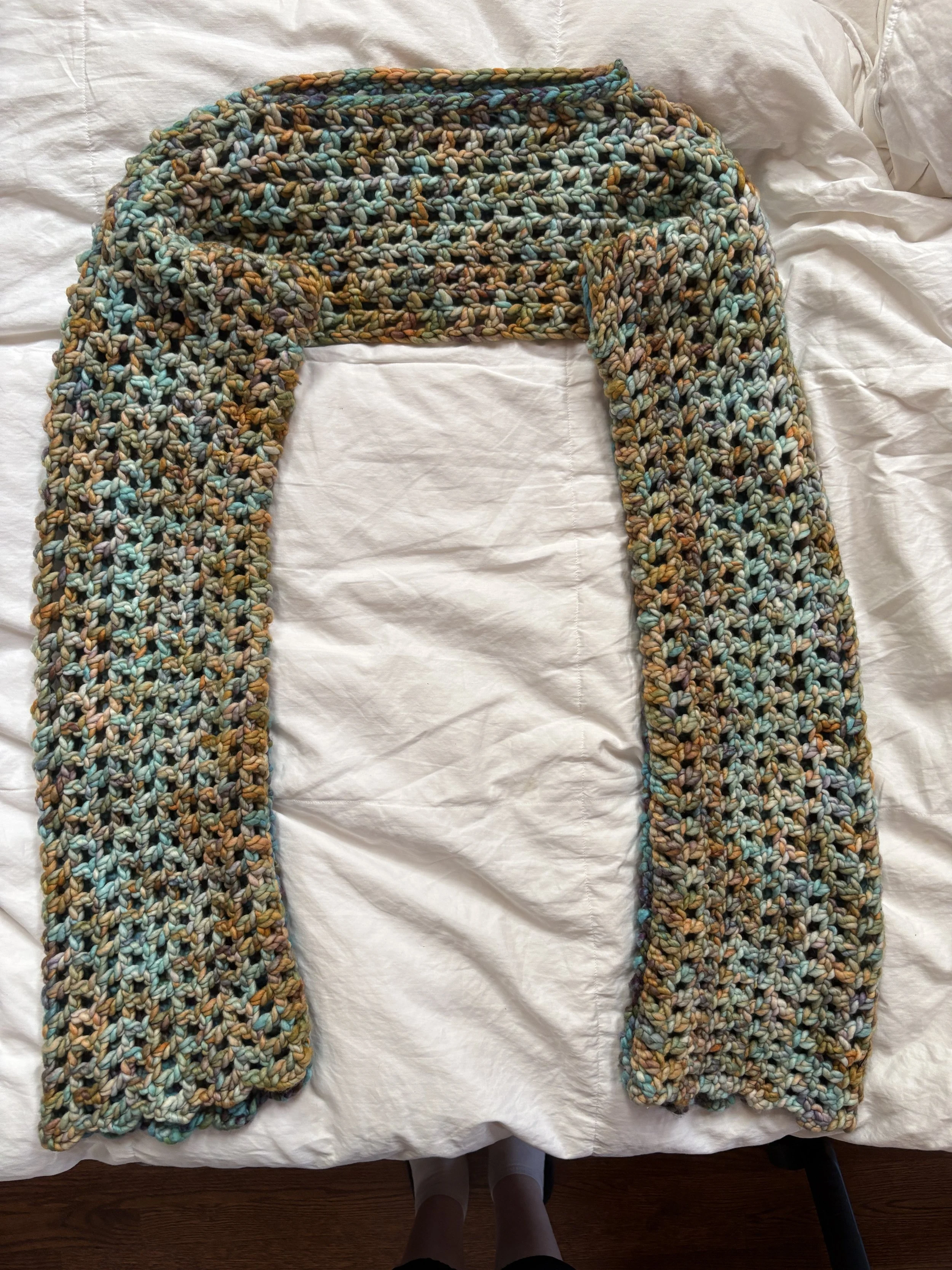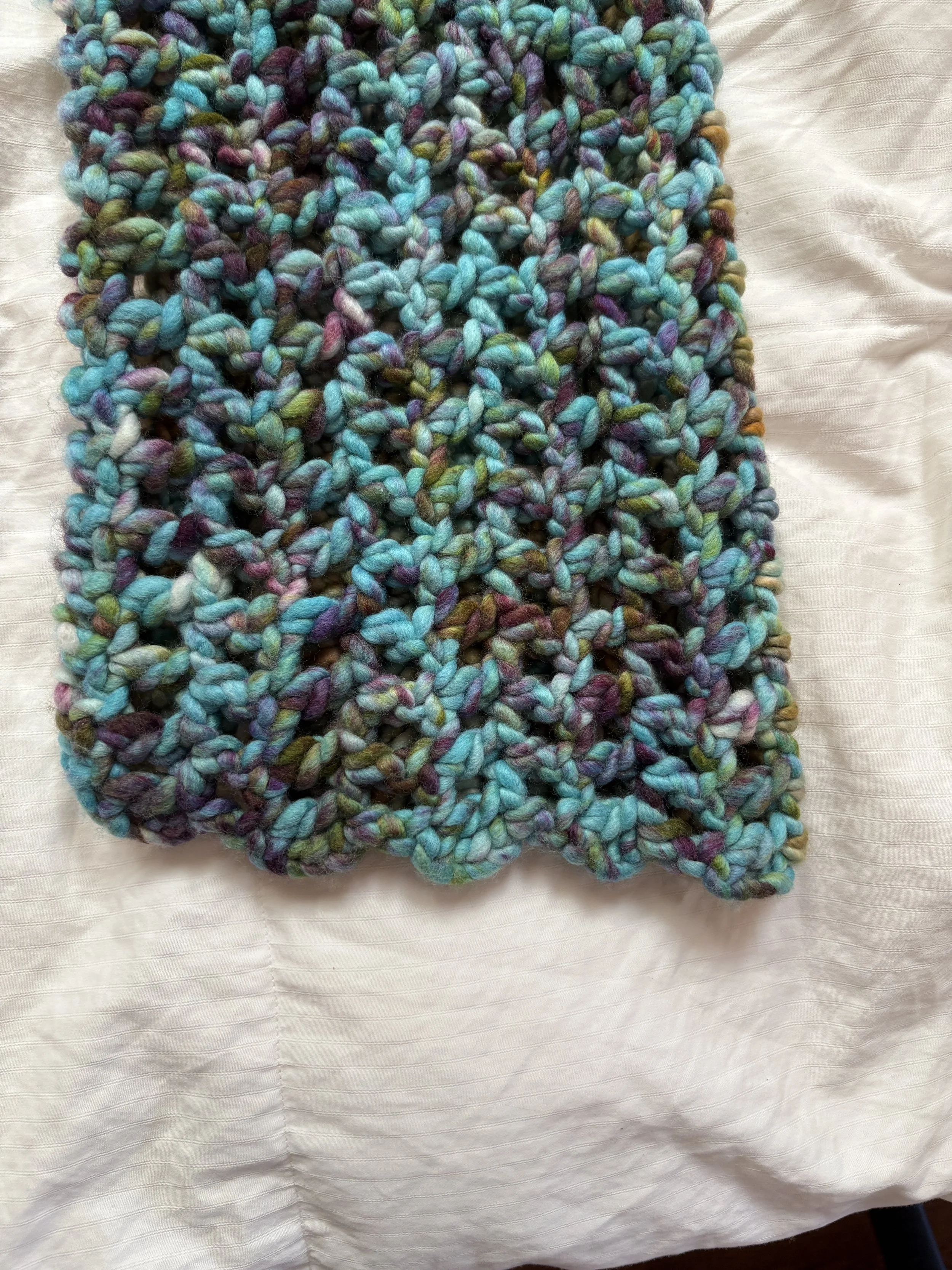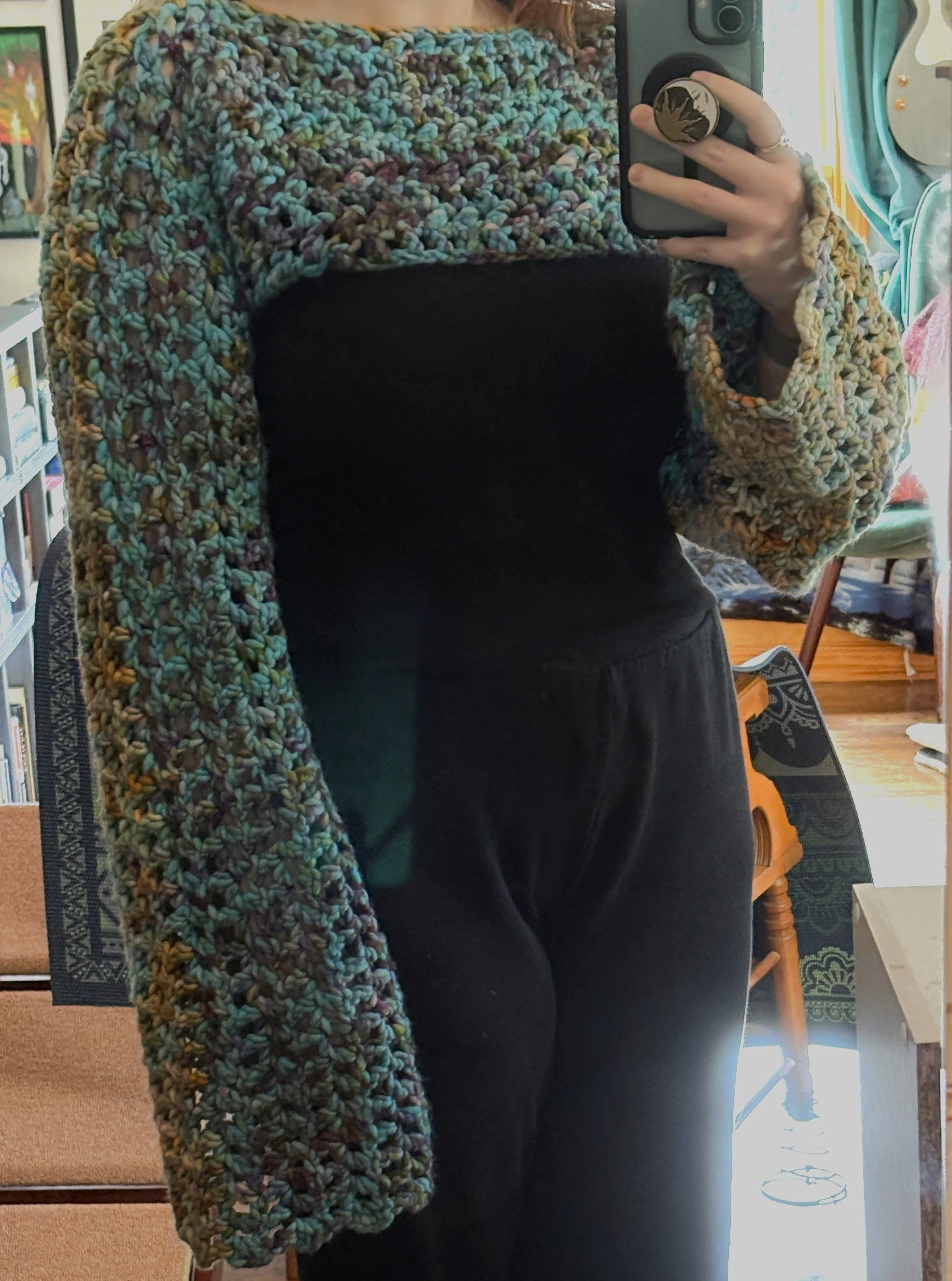 This project is worked as a long rectangle of double crochets that create the square mesh look. The neckline is created using changes and skipped stitches. I made it extra long in the sleeves and hand-washed with wool detergent before blocking it. One side is predominately color Amphibian with the neckline detail in Boomerang. The other side is Boomerang with the neckline detail in Amphibian. I also added a small charm of Minnesota at the end of one of the sleeves since I bought the materials and crocheted the whole project on a family vacation to Ely, MN. This is partly why I don’t have process photos only completed project photos!