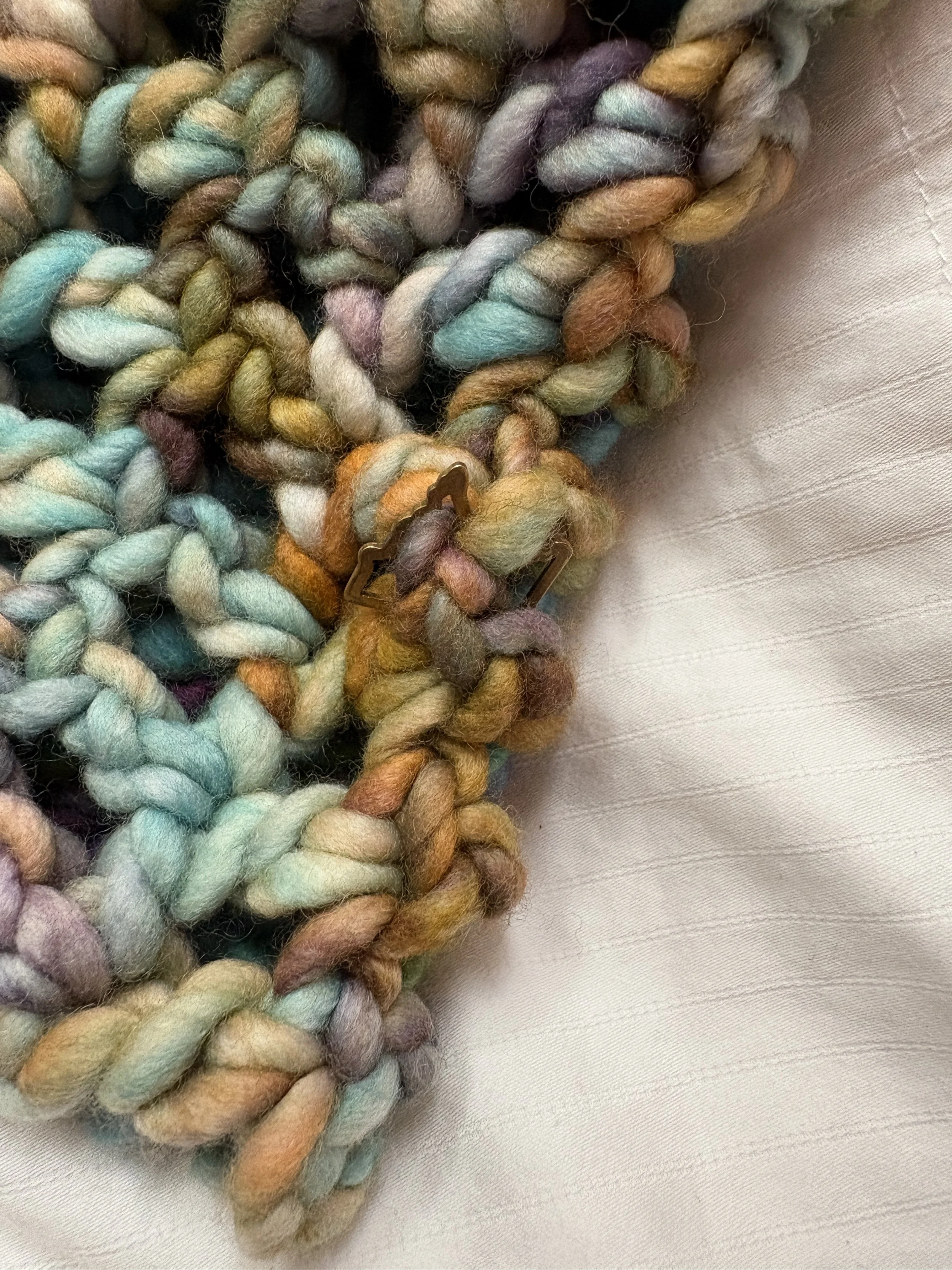 Yarn: 2.5 skeins of Rasta Malabrigo Super Bulky, Hand-Dyed, Marino Wool — Color: Amphibian and 2.5 skeins of Rasta Malabrigo Super Bulky, Hand-Dyed, Marino Wool — Color: Boomerang